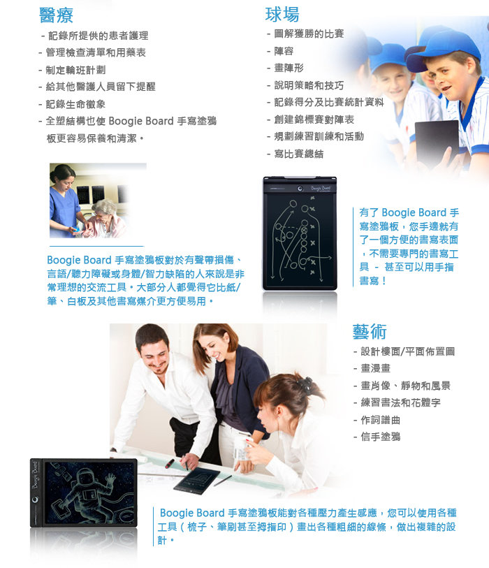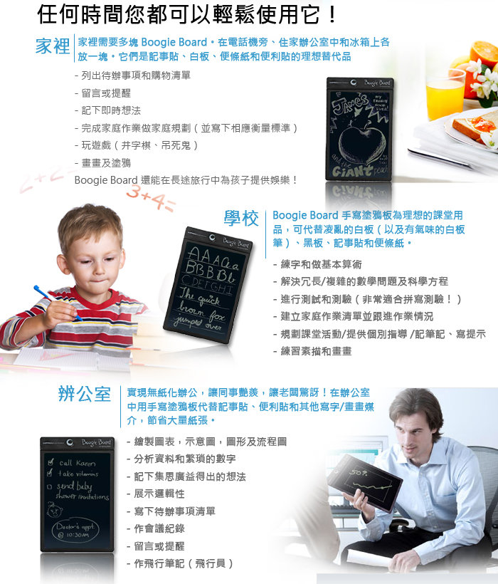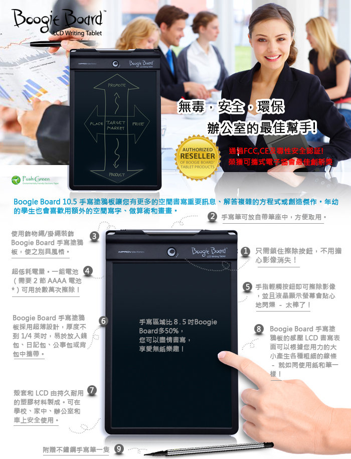 提供更多的空間讓你記下重要的訊息,解決複雜的程式或是創作你獨特的傑作。 Boogie Board Original 10.5 是Boogie Board系列中最大的尺吋,也是辦公室最佳的小黑板。 故障率低,沒電時可以換電池,是Boogie Board系列中銷售最久最實用的產品。